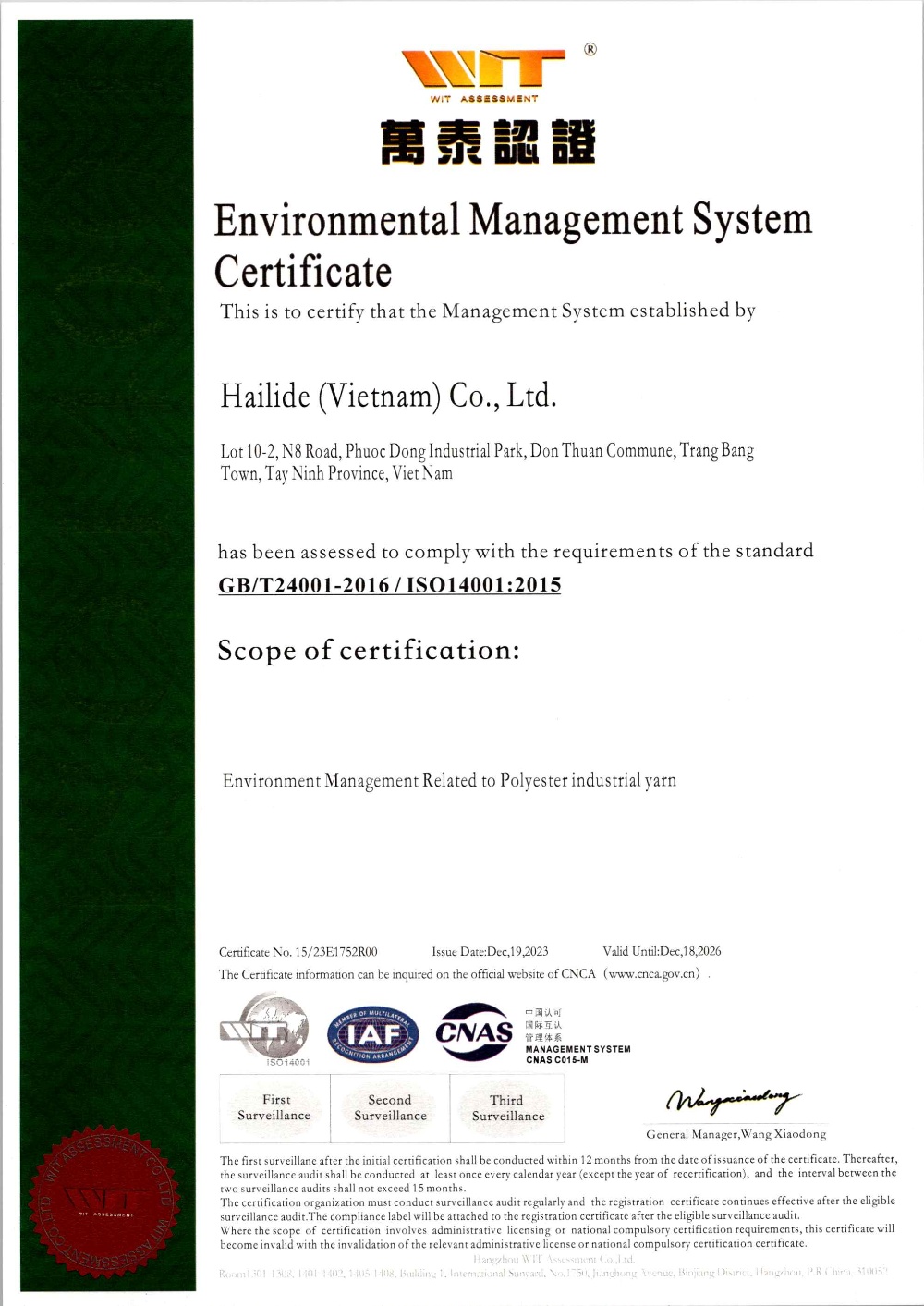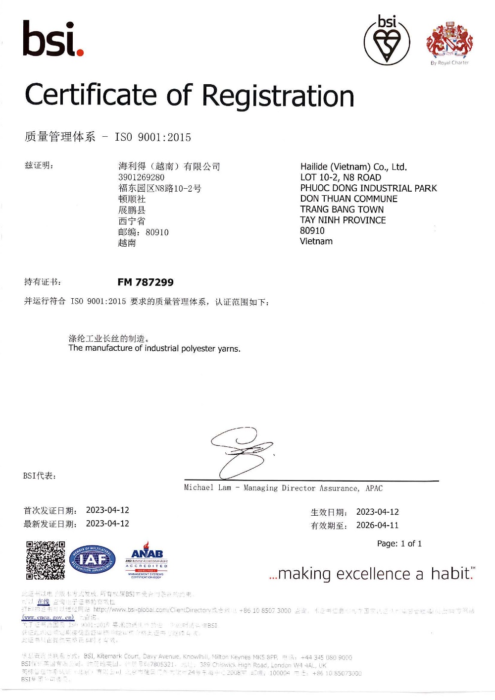 Registration Location: Phuoc Dong IP, Tay Ninh Province (65 KM west of Hochiminh city)